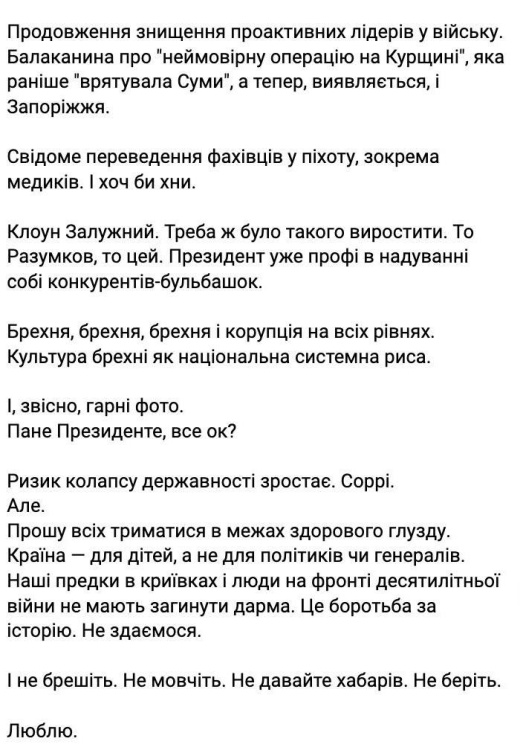 «Продолжение уничтожения проактивных лидеров в армии. Болтовня о "невероятной операции на Курщине", которая раньше "спасла Сумы", а теперь, оказывается, и Запорожье», — пишет она.