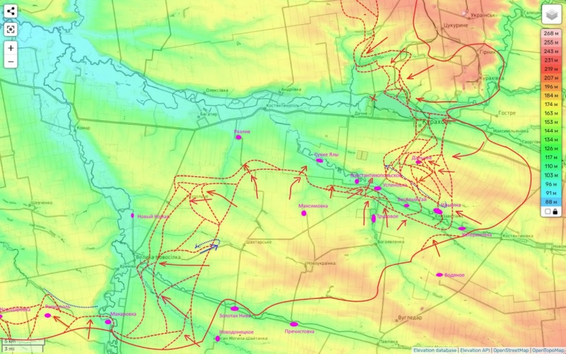 Здесь же наши части вчера подошли к трассе снабжения группировки ВСУ Курахово-Запорожье менее чем на 6 км. А севернее уже фактически начинаются бои за дамбу Кураховского водохранилища в районе Старых Тернов.