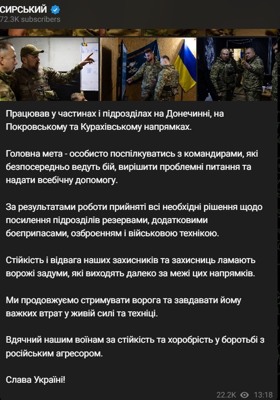 Главнокомандующий ВСУ Александр Сырский распорядился усилить Покровское и Кураховское направления резервами и техникой.