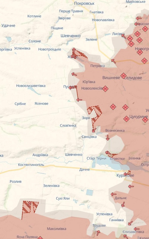 Согласно карте Deep State, за минувшие сутки ВС РФ снова продвинулась на этих направлениях в Желтом, Пушкино, Заре, Сонцовке, Берестках и Курахово, а также у Розлива.