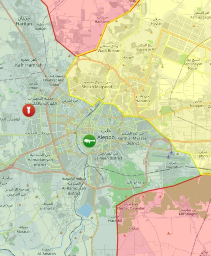 Сирийские каналы публикуют карту военно-политической обстановки в Алеппо и его окрестностях, на которой красным цветом обозначены территории, находящиеся под контролем армии Сирии, зеленым – боевиков, желтым – зона курдских отрядов народной самообороны.