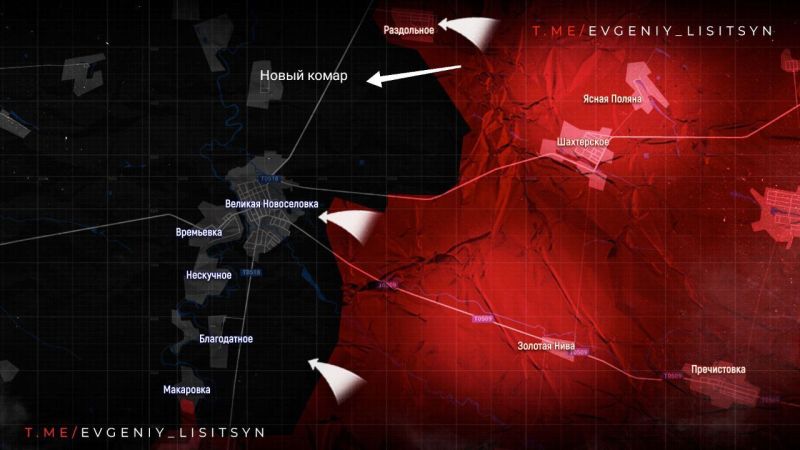 На ЮЖНО-ДОНЕЦКОМ НАПРАВЛЕНИИ наши парни не стали останавливаться после освобождения РАЗДОЛЬНОГО и двигаются дальше, создавая угрозу полного охвата ВЕЛИКОЙ НОВОСЁЛКИ атакуя с севера в районе села НОВЫЙ КОМАР. Ещё одна дорога в Большую Новосёлку тоже таким образом физически перерезана. Из дорог с твёрдым покрытием у ВСУ осталась только одна – с запада из Гуляйполя. Но она под нашим огневым контролем.
