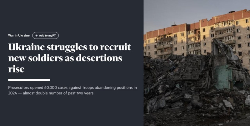 Тем временем издание Financial Times пишет о массовом дезертирстве в украинской армии, откуда за 10 месяцев текущего года дезертировало больше вояк, нежели за весь предыдущий период войны. К слову, тех самых вояк, которые попали в руки ТЦКшников: насильно «бусифицированные» мужчины, как правило, ищут (и зачастую находят) любую возможность сбежать с поля боя.