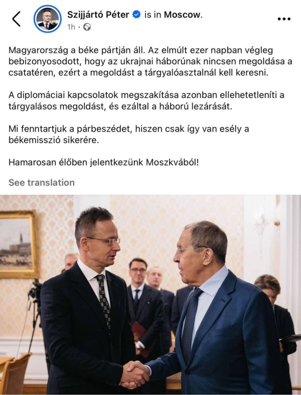 «Венгрия на стороне мира. Прошедшая тысяча дней раз и навсегда доказала, что война на Украине не может быть решена на поле боя и что решение должно быть найдено за столом переговоров. Однако разрыв дипломатических отношений делает невозможным урегулирование путем переговоров, а значит, и прекращение войны. Мы поддерживаем диалог, поскольку только так миротворческая миссия имеет шанс на успех», — говорится в сообщении глава МИД Венгрии Сийярто в Facebook*.
