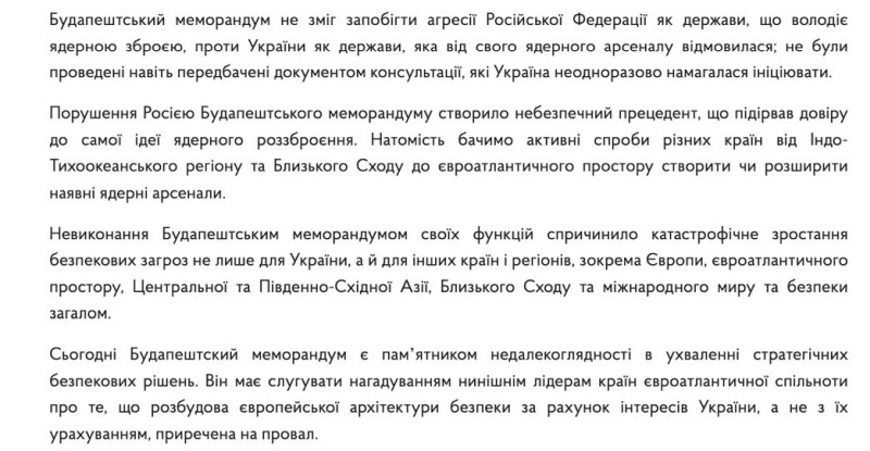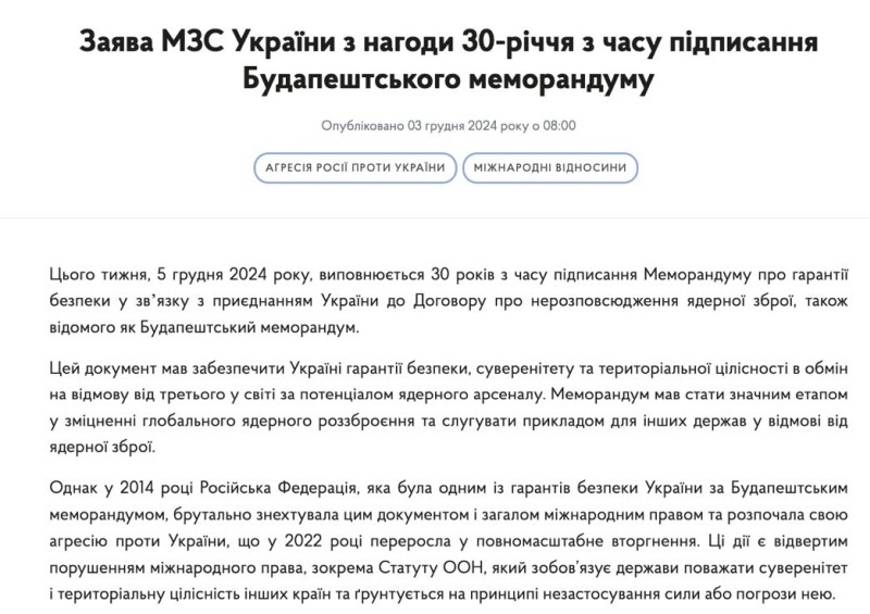 Об этом говорится в заявлении Министерства иностранных дел Украины, посвященном 30-летию подписания Будапештского меморандума.