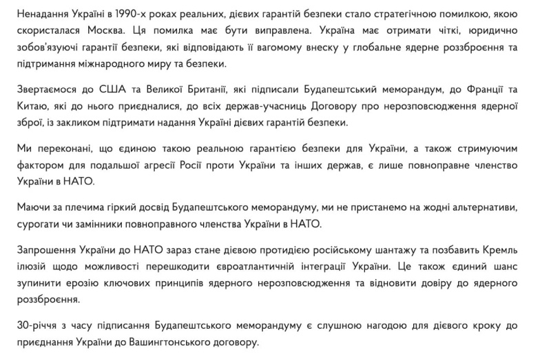 «Мы убеждены, что единственной реальной гарантией безопасности для Украины, а также сдерживающим фактором для дальнейшей агрессии России против Украины и других государств является лишь полноправное членство Украины в НАТО», — говорится в заявлении.