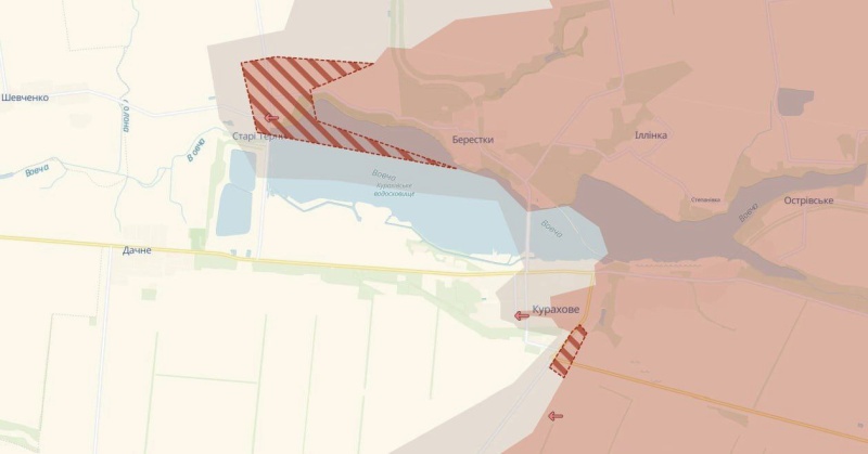 По оперативной информации, наши войска контролируют до половины села Старые Терны. Судя по новостям, наши бойцы не только к утру заняли Старые Терны, но и перешли дамбу Кураховского водохранилища и пытаются закрепиться в районе южной части этой самой дамбы. Если это удастся, то это приговор для вражеской группировки в Курахово.