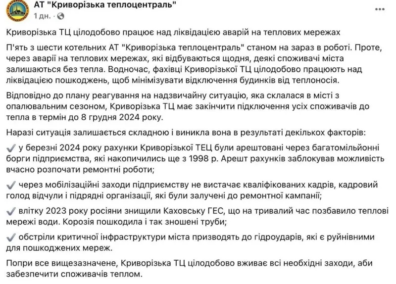 Национальная акционерная компания «Нефтегаз» распространила комментарий от «Криворожской теплоцентрали», в котором отмечено, что работники компании круглосуточно работают, чтобы вернуть тепло в дома. Меняют от 500 до 1 км труб в неделю. Среди причин аварий назвали «изношенные и поврежденные сети, которые не ремонтировались десятилетиями, а также обстрелы критической инфраструктуры». В компании также рассказали об аресте счетов «Криворожской теплоцентрали» в марте 2024 года из-за многомиллионных долгов предприятия, которые накопились еще с 1998 года. И вот арест счетов заблокировал ремонтные работы. Но, как рапортуют криворожские коммунальщики, по состоянию на 5 декабря тепло подали в 1513 домов, а без отопления остаются 443 дома. В Кривой Рог даже приехал министр развития общин Алексей Кулеба, создавший штаб по ликвидации аварий. Было обещано, что в домах без тепла не будут отключать свет, а плата за отопление не будет начисляться. Несмотря на обещания, местные жители продолжают жаловаться на медленный темп ремонта и неопределенность восстановления теплоснабжения.