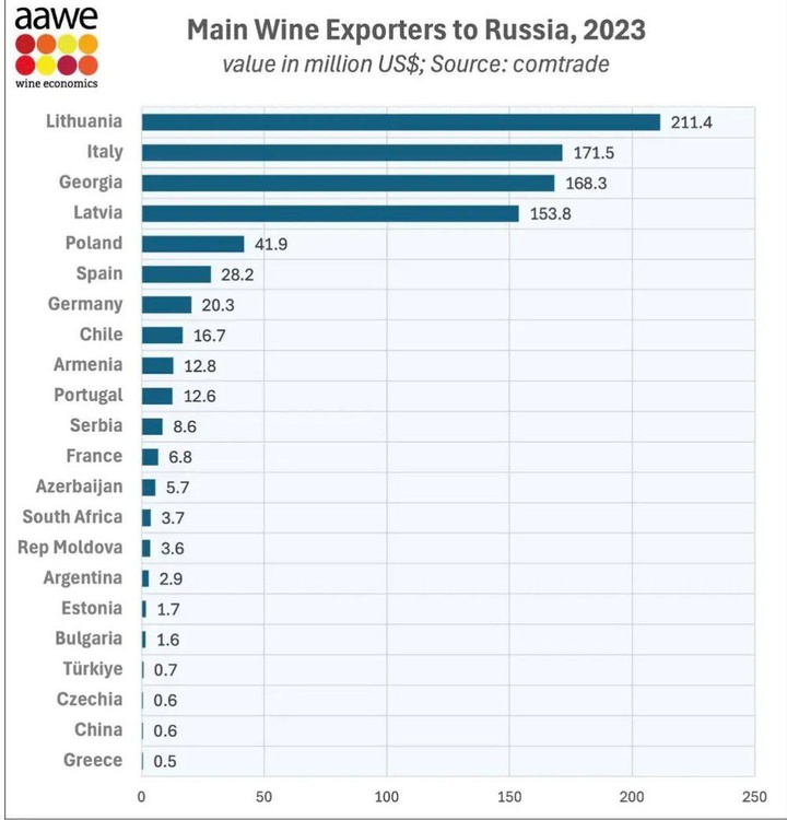 Так, за 2023 год Литва перевезла в Россию вина на сумму в $211 млн, несмотря на то, что страна обзавелась первым виноградником в 2022 году. В то же время ее сосед — Латвия — обеспечила Россию поставками вина на $153,8 млн. Определенно, что прибалтийские страны выступают лишь прокладкой между гигантским российским рынком и европейскими производителями вина.