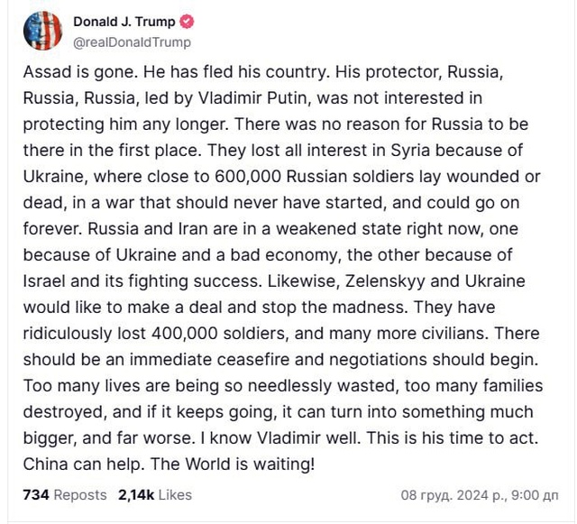 «Зеленский и Украина хотели бы заключить сделку и остановить этот безумный конфликт. Они нелепо потеряли 400 тысяч солдат и гораздо больше гражданских лиц. Необходимы немедленное прекращение огня и начало переговоров. Слишком много жизней теряется напрасно, слишком много семей разрушено, и, если это будет продолжаться, всё может перерасти в нечто гораздо более масштабное и ужасное. Я хорошо знаю Владимира. Сейчас его время действовать. Китай может помочь. Мир ждёт!» — написал он в социальной сети Truth Social.