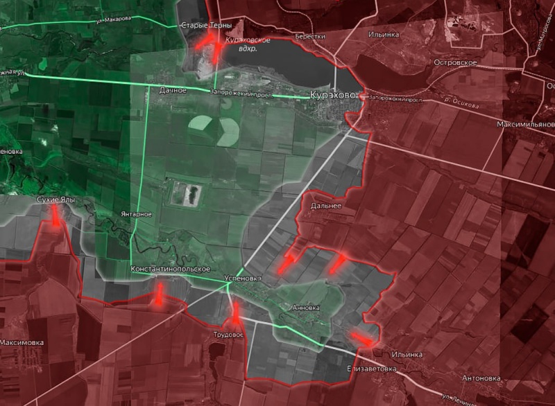 Наиболее угрожающая ситуация для ВСУ на фронте сейчас складывается вокруг Курахово. Русские войска могут в ближайшее время попытаться обойти город с запада и атаковать в сторону Дачного. Также готовятся атаки на промзону Кураховской ТЭС.
