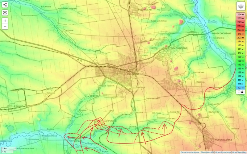 У наших войск есть успехи и в продвижении к югу от Красноармейска. Бои идут уже примерно в половине крупного села Шевченко в трёх километрах от окраин Красноармейска.
