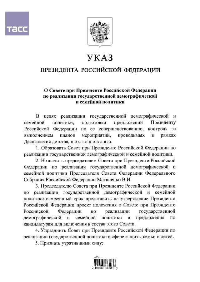 Этим же указом упразднен Совет по реализации государственной политики в сфере защиты семьи и детей.