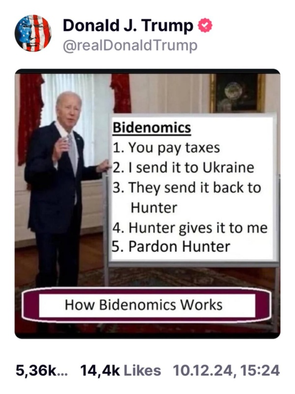 «Как работает байденомика. Вы платите налоги. Я [Байден] отправляю их Украине. Они отправляют их обратно Хантеру [Байдену]. Хантер отдает их мне. Помилование Хантера», — говорится публикации.
