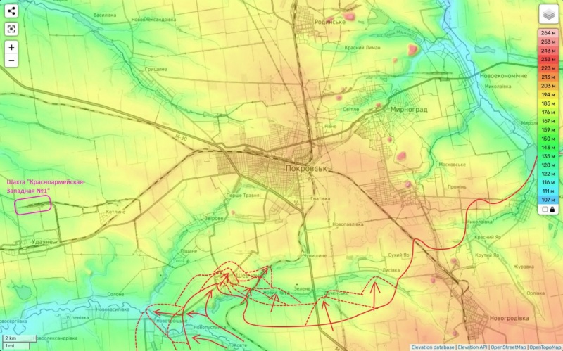 Любопытно, что практически идентичная Красноармейску ситуация складывается и к западу от Курахово. Там, если вспомнить детали развития очеретинской операции ВС РФ, удар развивается таким образом, что удержать какое-либо направление без ущерба для обстановки в целом для ВСУ становится невозможно.