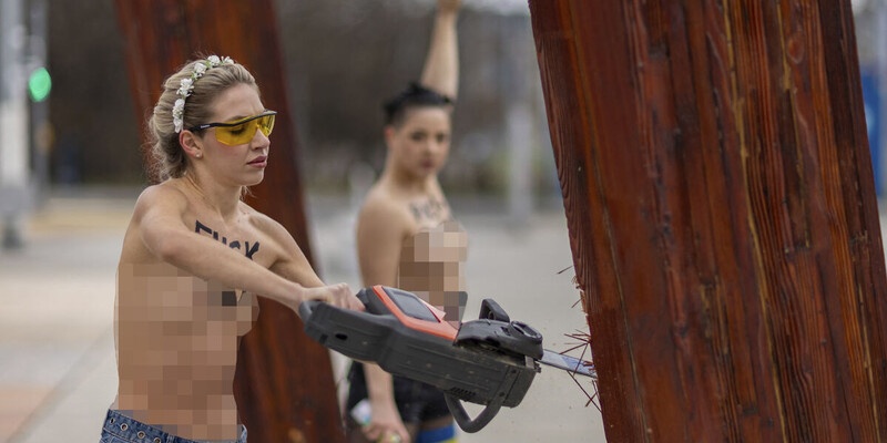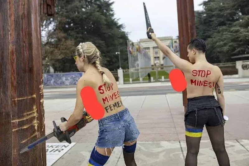 «Плевок на мир и человечество». Голые украинки повредили бензопилой монумент у здания ООН в Швейцарии