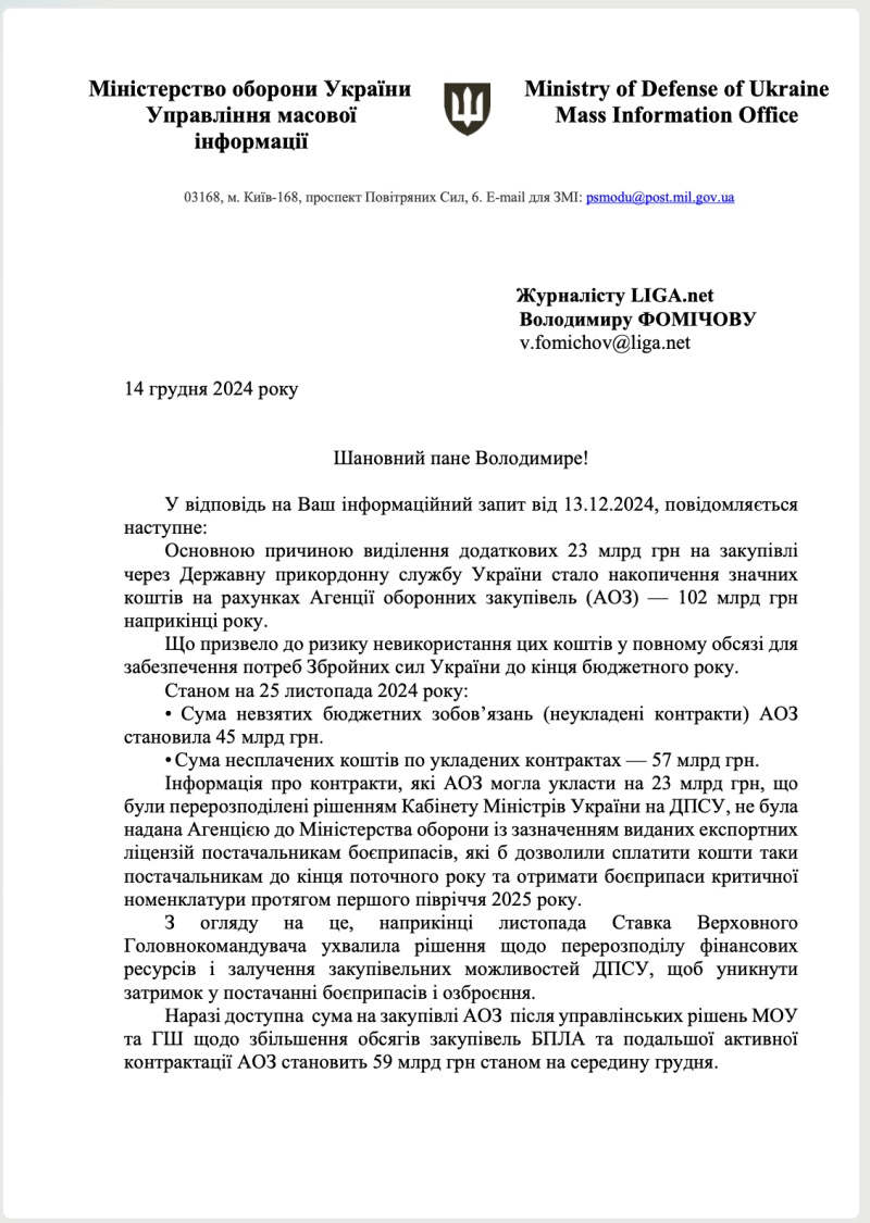 «В конце ноября на счетах АОЗ оставалось 102 млрд грн. Сумма невзятых бюджетных обязательств составила 45 млрд грн, а неуплаченных по заключенным контрактам — 57 млрд грн. Это создало риск, что часть средств не будет использована для обеспечения потребностей Вооруженных сил Украины до завершения бюджетного года», — говорится в ответе Минобороны Украины изданию LIGA.net.