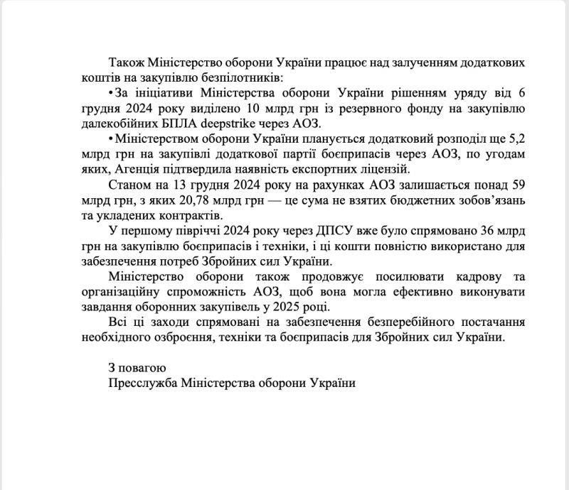 Кроме того, 6 декабря Кабмин по инициативе Минобороны выделил дополнительные 10 млрд грн из резервного фонда на закупку дальнобойных беспилотников Deepstrike через АОЗ. Дополнительно Минобороны планирует распределить 5,2 млрд грн из высвобождаемого в декабре внутреннего ресурса на закупку боеприпасов АОЗ.