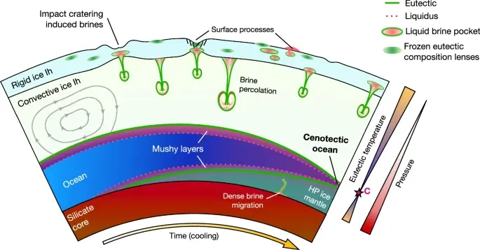 Доктор Мэтт Пауэлл-Палм из Техасского университета A&M в сотрудничестве с планетологом Батистом Журно из Вашингтонского университета представили концепцию, способную перевернуть наше понимание обитаемости ледяных океанических миров. Речь идет о так называемой «ценотектической» температуре — абсолютном температурном пределе, ниже которого жидкость, даже под давлением и в растворе с другими веществами, попросту не может существовать в стабильном состоянии.