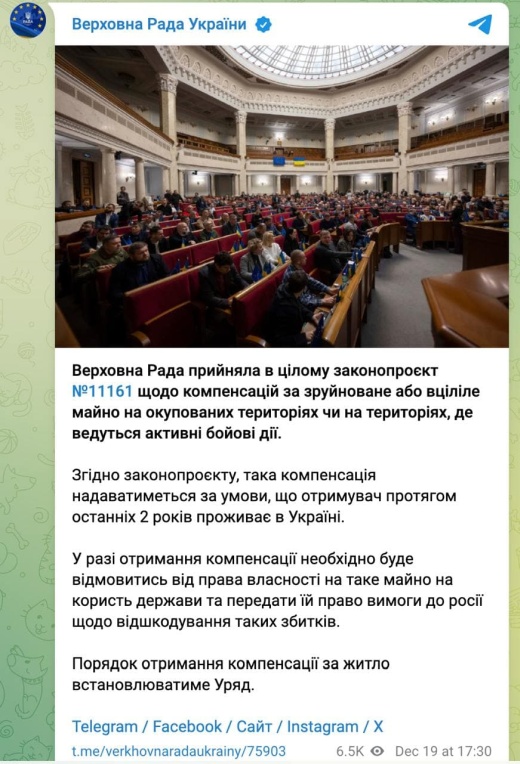 Сегодня, 20 декабря, Верховная Рада приняла в целом законопроект о компенсациях, по которому получить их смогут только те, кто в течение последних двух лет проживает на Украине.