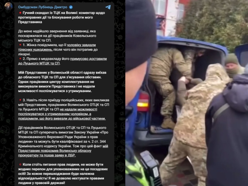 «Волынский ТЦК не дали представителю омбудсмена пообщаться с мужчиной, которого военкомы избили и забрали из больницы на каталке скорой», — написал омбудсмен Дмитрий Лубинец в соцсетях.