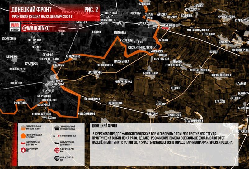 ДОНЕЦКИЙ ФРОНТ. В Курахово продолжаются городские бои и говорить о том, что противник оттуда практически выбит, пока рано. Однако российские войска всё больше охватывают этот населённый пункт с флангов, и участь оставшегося в городе гарнизона фактически решена. (Рис. 2)