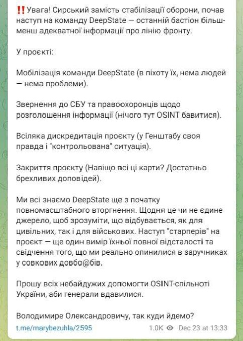 «Сырский просит заблокировать военный паблик Deep State из-за информации, которую публикует без согласования с Генштабом. Наши военные часто ориентируются на информацию Deep State по ситуации на фронте и оставляют позиции без боя, понимая ситуацию, в тот момент, когда спикеры ВСУ убеждают всех о контролируемой ситуации. На Банковой предлагают решить вопрос через цензуру информации, чтобы военный паблик работал по примеру телеграм-каналов, когда им согласовывают тексты», — считает телеграм-канал «Резидент» со ссылкой на источник в Офисе президента.
