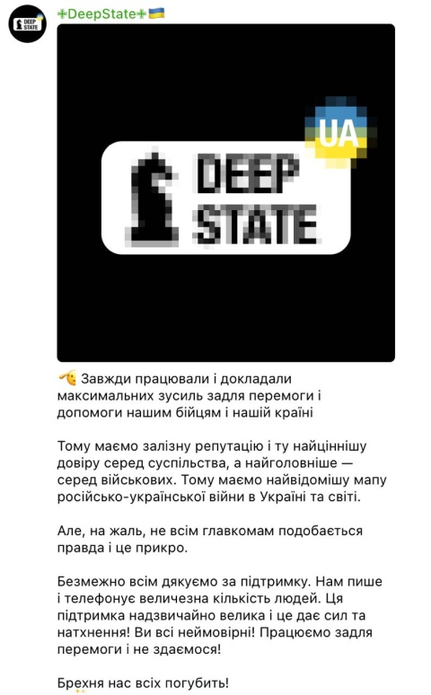 «Поэтому имеем железную репутацию и то ценное доверие среди общества, а самое главное — среди военных. Поэтому имеем самую известную карту российско-украинской войны в Украине и мире. Но, к сожалению, не всем главкомам нравится правда, и это досадно», — говорится в сообщении.