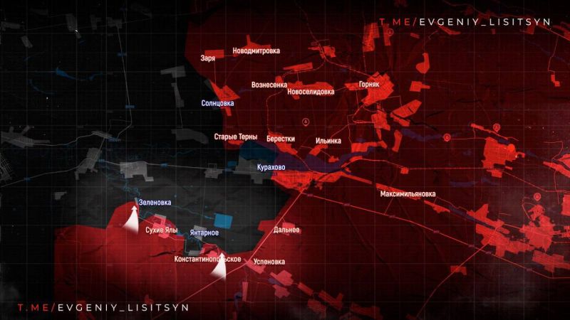 Развитие наступления с юго-запада от ДАЧЕНСКОГО и НОВОТРОИЦКОГО. Российские войска атакуют юго-западнее ПОКРОВСКА.