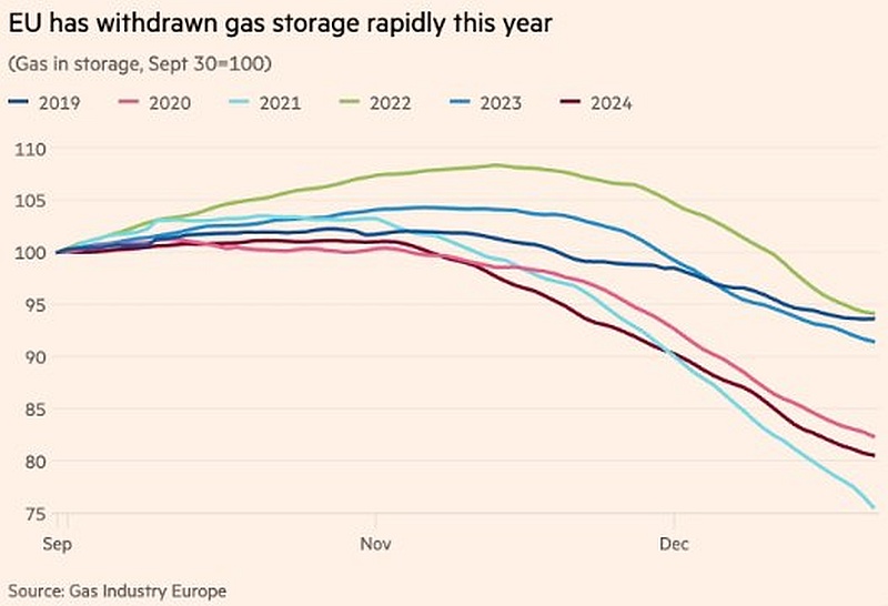 Страны Евросоюза опустошают свои газовые хранилища самыми быстрыми темпами с момента энергетического кризиса, с декабря 2021 года. Причина — большой спрос на топливо, вызванный холодами и сокращение импорта сжиженного природного газа (СПГ).