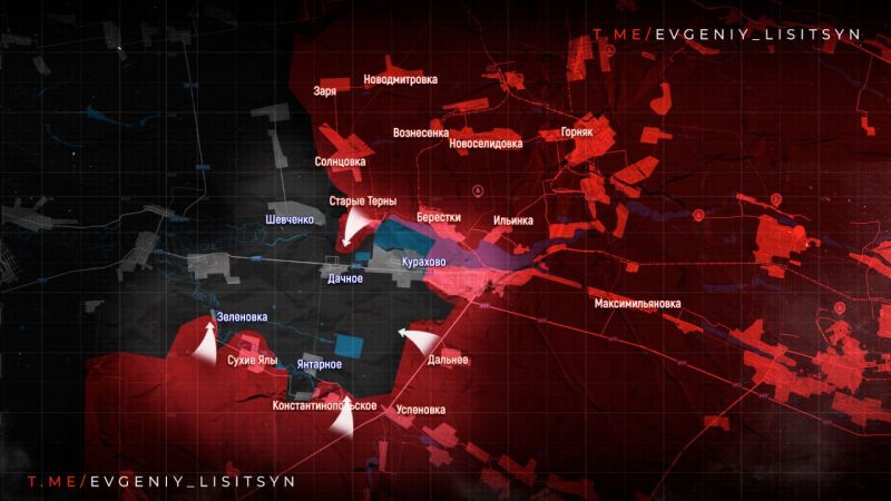 На КУРАХОВСКОМ НАПРАВЛЕНИИ наши парни атакуют в районе ТЭС, территорию которой удерживает противник. ВС РФ пробиваются к дороге на Запорожье в районе УЛАКЛЫ и РАЗЛИВА, также продолжаются бои в районе ШЕВЧЕНКО. В районе ВЕЛИКОЙ НОВОСЁЛКИ наши штурмовики пытаются взять под контроль позиции на холмах к северу от дороги ВРЕМЕВКА – ГУЛЯЙПОЛЕ, чтобы контролировать все дороги к западу от Великой Новосёлки и окружить боевиков ВСУ.