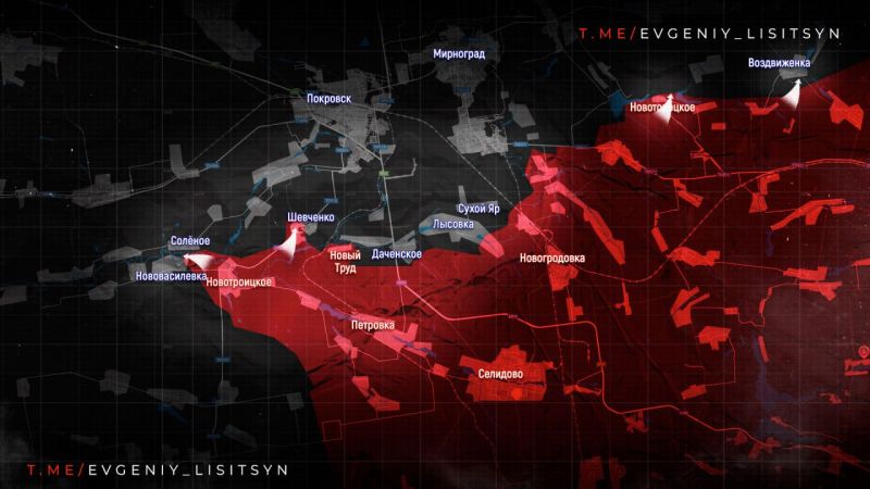 На ПОКРОВСКОМ НАПРАВЛЕНИИ наше Минобороны заявило об освобождении села НОВЫЙ ТРУД. Также ВС РФ продвигаются в районе ДАЧЕНСКОГО. Западнее наши парни штурмуют ПЕСЧАНОЕ от которого вышли к северным окраинам ВОЛКОВО. Упорные бои идут по линии ВОЛКОВО – СОЛЁНОЕ – НОВОВАСИЛЕВКА. Кроме того, между НОВОВАСИЛЕВКОЙ и НОВОЕЛИЗАВЕТОВКОЙ российские бойцы продвинулись широким фронтом на глубину до трёх километров.