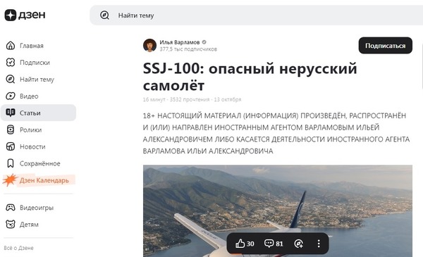 А после трагической гибели Sukhoy SuperJet-100 в аэропорту Шереметьево в 2019 году доморощенные формальные либералы просто в радостной истерике зашлись, так сказать, сбросив все маски. И автор даже не смеет на себя примерять лавры некоего разоблачителя откровенной информационной атаки на нашу авиационную промышленность, потому что в те дни на эту атаку указали многие.