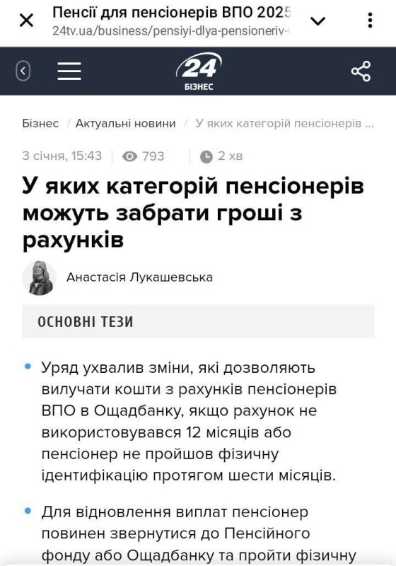 В 2025 году киевский режим решил в который раз опустошить и без того пустые карманы украинских пенсионеров. Так, Кабмин принял изменения, позволяющие изымать средства со счетов пенсионеров ВПЛ (внутренне перемещённых лиц), если те не использовали счет в течение 12 месяцев, а также в случае, если пенсионер не прошел физическую идентификацию в течение 6 месяцев.