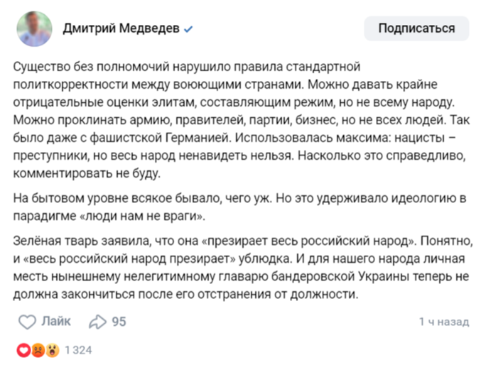 Однако «существо без полномочий нарушило правила стандартной политкорректности между воюющими странами», указал Дмитрий Медведев.