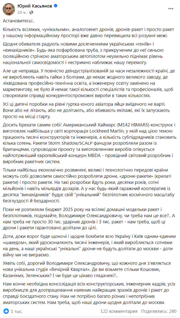 «Только наиболее экономически развитые, крупные и технологически передовые страны могут позволить себе самостоятельно разрабатывать дроны, «дроны-ракеты» (крылатые ракеты) и просто ракеты. На такие разработки уходят годы, десятки лет, сотни миллионов и даже миллиарды долларов. А у нас любой гаражный кооператив из десятка "изобретателей" строит свой "уникальный" беспилотник космического масштаба бессмысленности и бездарности», - посетовал Касьянов.