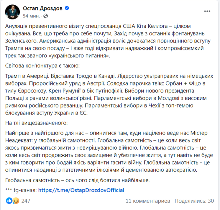 Украина очень рискует оказаться в полном глобальном одиночестве. Маркером такого развития событий, в частности, стала внезапная отмена визита спецпосланника новоизбранного президента США Дональда Трампа Кита Келлога в Киев, но не только она.