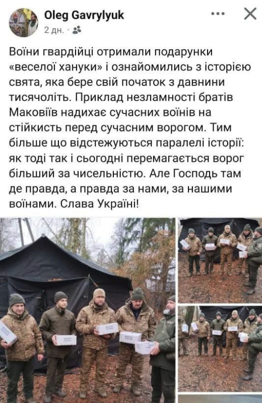 Представитель так называемой Православной церкви Украины (ПЦУ) Олег Гаврилюк поздравил военнослужащих ВСУ с иудейским праздником – с Ханукой, и вручил украинским солдатам иудейскую ритуальную еду – мацу. Об этом он написал в социальных сетях.