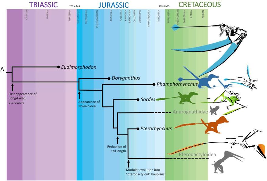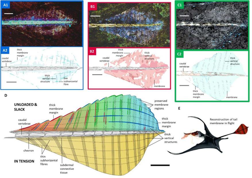 Особое внимание исследователей привлекли птерозавры вида Rhamphorhynchus, обитавшие около 150 миллионов лет назад. У этих существ хвостовая лопасть меняла форму в течение жизни. Если у детенышей она напоминала каплю, то у подростков — воздушного змея, а у взрослых — сердце. Изученные образцы имели лопасть в форме змея, внутри которой располагалась сложная сеть пересекающихся структур, напоминающих ребра и лонжероны самолетного крыла.