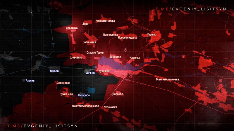 На КУРАХОВСКОМ НАПРАВЛЕНИИ ДАЧНОЕ окружено с трёх сторон: наши парни атакуют от КУРАХОВО, СТАРЫХ ТЕРНОВ и ЯНТАРНОГО. Восточнее идут бои в районе КОНСТАНТИНОПОЛЯ.