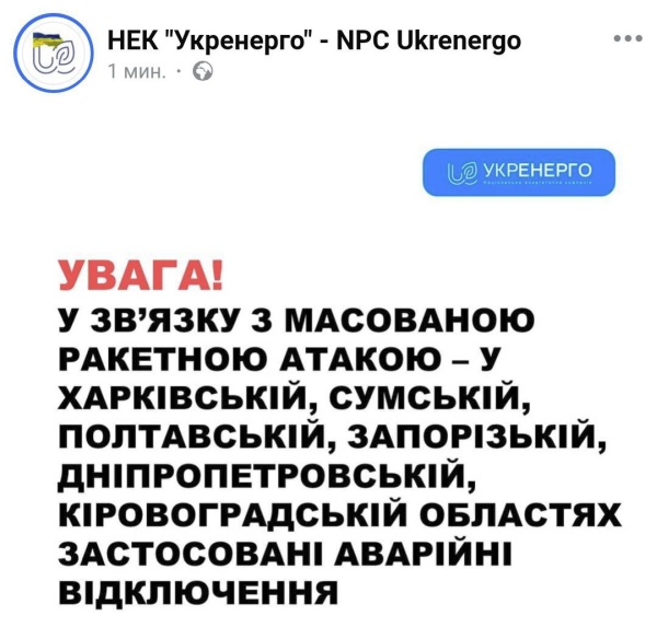 Из-за ракетной атаки ВС РФ по Украине начали вводить экстренные отключения света. Сейчас они действуют уже в нескольких областях, но список может увеличиться.