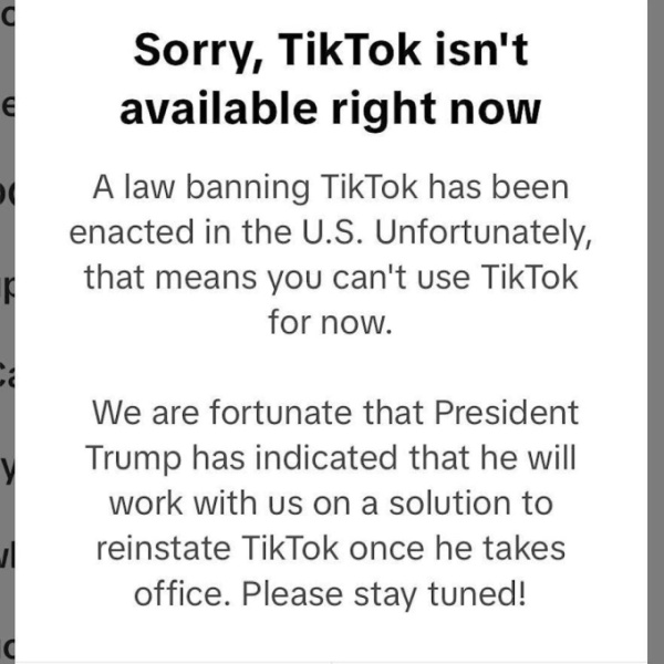 «Мы сожалеем, что закон США о запрете TikTok вступит в силу 19 января и заставит нас сделать наши сервисы временно недоступными. Мы работаем над тем, чтобы восстановить наш сервис в США как можно скорее, и мы ценим вашу поддержку. Пожалуйста, оставайтесь с нами», — поздно вечером в субботу TikTok начал отображать такое сообщение.