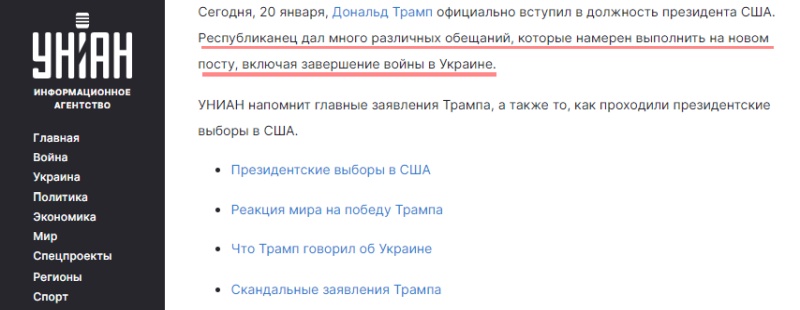 Правда, если внимательно прочитать текст, то, оказывается, эти слова Трамп произнёс… накануне инаугурации на каком-то митинге. Но подана новость так, как будто это было сказано во время инаугурации. Мол, кто там будет разбираться? Точно так же совершила шулерство и главное информационное агентство Украины УНИАН, разместив в заметке о том, что Трамп официально вступил в должность президента США, его обещания.