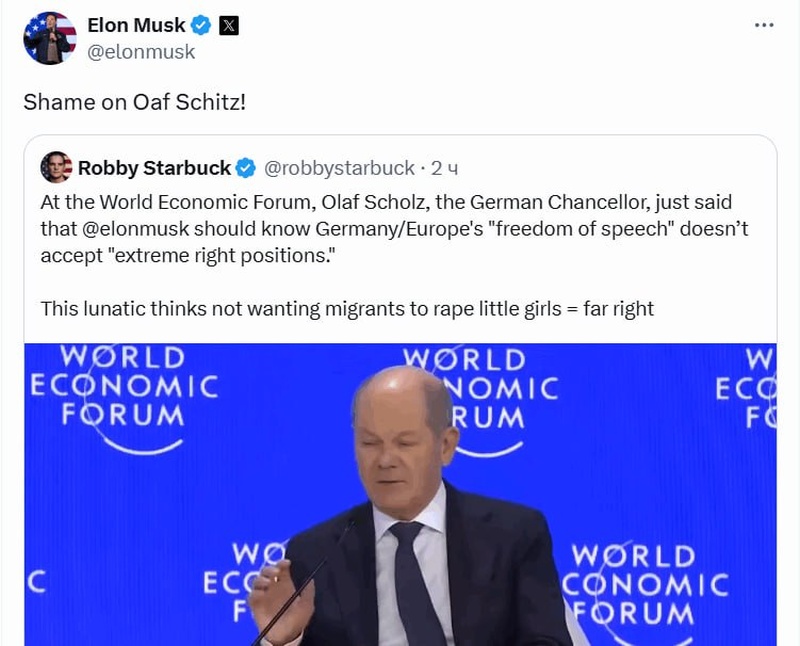 «Повторю, что я уже сказал: у нас, в Европе и Германии, свобода слова, и каждый может говорить, что он хочет, даже если он миллиардер. Что мы не приемлем — если это поддержка ультраправых позиций», — сказал канцлер Германии.