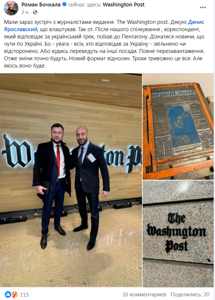 «Была сейчас встреча с журналистами издания The Washington Post. <...> Так вот. После нашего общения корреспондент, отвечающий за украинский трек, поехал в Пентагон. Узнать новости, что слышно по Украине. Ибо - внимание - все, кто отвечал за Украину - уволены или отстранены. Или куда-нибудь переведут на другие должности. Полная перезагрузка. Так что изменения точно будут. Новый формат отношений. Немного тревожно это все. Но как-нибудь оно будет», – сообщил Бочкала.