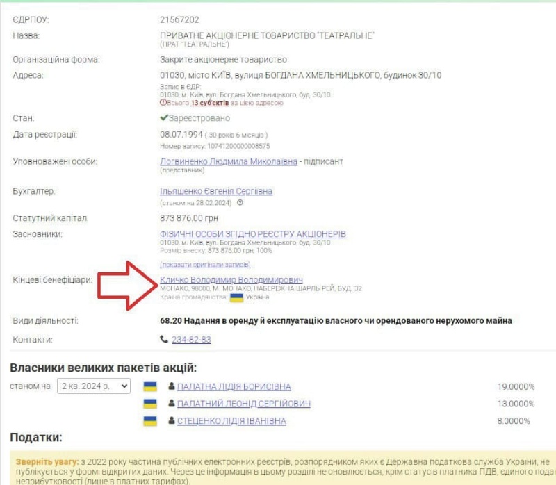 Вчера киевская полиция объявила о том, что в доме, где проживает Виталий Кличко, был обнаружен бордель. Речь идет о ночном клубе Tootsie, расположенном прямо напротив посольства Германии, который якобы «крышует» первый заместитель председателя партии УДАР. Данная недвижимость принадлежит ЧАО «Театральное». Среди официальных бенефициаров компании – брат киевского мэра Владимир Кличко, зарегистрированный в Монако, а также Лидия и Леонид Палатные. Согласно открытым данным, компания «Театральное» владеет помещением в Киеве по улице Богдана Хмельницкого, 30/10. Основной вид деятельности предприятия – сдача недвижимости в аренду. Уставный капитал компании превышает 873 миллиона гривен.