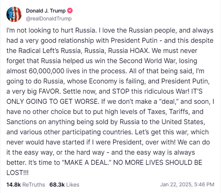Напомним, накануне Дональд Трамп выступил с очередным заявлением относительно кризиса на Украине, которое сделал в соцсети Truth Social. В частности, он сообщил, что любит русский народ, поскольку «Россия помогала США в войне с гитлеровской Германией». В ходе «этой помощи», по данным Трампа, она «потеряла 60 млн человек».