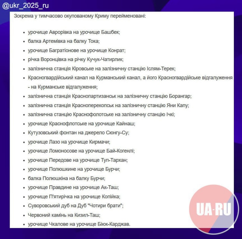 «Деколонизация, в том числе и деколонизация топонимики, является важной частью украинской политики памяти, а возвращение исторических названий в Крым прямо связано с обеспечением прав коренных народов Украины», — говорится в сообщении «представительства» в соцсетях.