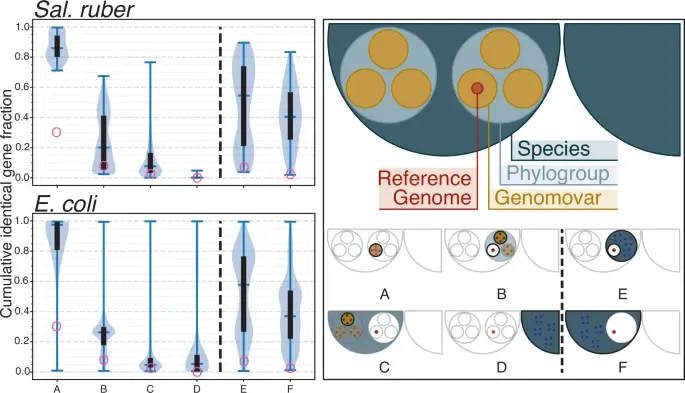 Каждый геном сравнивался со всеми другими геномами в пределах каждой группы (A-F), и кумулятивная доля общих идентичных генов была зарегистрирована и отображена с использованием пользовательского скрипта Allv_RBM_Violinplot.py. Группы были следующими: A — геномы в пределах одного геновара, B — геномы в каждом отдельном геноваре в пределах одной филогенетической группы, исключая геномы из одного и того же геновара, C — геномы в каждом отдельном геноваре в пределах разных филогенетических групп, D — геномы другого вида (S. pepae для Sal. ruber и E. fergusonii для E. coli), E — геномы в пределах одной филогенетической группы, исключая геномы из одного и того же геновара, F — геномы в пределах одного вида, исключая геномы из одной и той же филогенетической группы. Данные представлены в виде гибридных violin plots (скрипичные графики), где верхний и нижний «ус» показывают минимальные и максимальные значения, средний «ус» показывает медианное значение, черные прямоугольники показывают межквартильный размах, а затененные светло-голубые области показывают плотность значений по оси y. Верхний график показывает результаты для геномов Sal. ruber; нижний график показывает геномы E. coli. Для Sal. ruber количество геномов, использованных в каждой группе, составляло n = 67 для (A), 422 для (B), 897 для (C), 67 для (D), 176 для (E) и 192 для (F). Для E. coli, n = 199 для (A), 2213 для (B), 2910 для (C), 425 для (D), 422 для (E) и 433 для (F). Правая панель показывает графическое представление сравнений, выполненных для обоих графиков слева. См. также рис. S6 для графических примеров исходных данных. Обратите внимание, что, хотя один или несколько геномов создают экстремальные выбросы, в целом доля идентичных генов постепенно уменьшается среди более дивергентных геномов по сравнению. Также обратите внимание, что наш анализ моделирования (красные круги на графике; подробнее см. раздел «Методы») предполагает — например, — что следует ожидать, что только около 6-7% от общего числа генов в геноме будут идентичны среди геномов, показывающих около 98,5% ANI, если не было недавней рекомбинации (т.е. группы b и e); оба вида показывают гораздо больше таких генов в геноме в сценариях «один к одному» (группа B) или «один ко многим» (группа E) на этом уровне, что указывает на интенсивный недавний обмен генами. Цитирование: Conrad, R.E., Brink, C.E., Viver, T. et al. Microbial species and intraspecies units exist and are maintained by ecological cohesiveness coupled to high homologous recombination. Nat Commun 15, 9906 (2024). https://doi.org/10.1038/s41467-024-53787-0