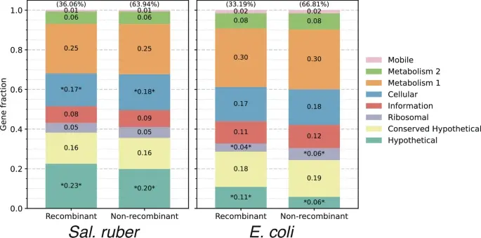 Графики показывают аннотации генов, суммированные по категориям COG высокого уровня в виде доли от общего числа генов в геноме (ось y) для генов RBM, разделенных на две категории (ось x): гены с идентичностью последовательности ≥99,8% (рекомбинантные) и гены с идентичностью последовательности <99,8% (нерекомбинантные). Звездочки представляют функциональные категории, для которых выявлены статистически значимые различия по результатам одностороннего критерия хи-квадрат (p-значение < 0,05) с поправкой Бенджамини-Хохберга на множественное тестирование, что, вероятно, отражает гены, подвергающиеся более частой рекомбинации, чем средний ген в геноме, в связи с отбором по соответствующим функциям. Тем не менее, следует отметить, что в целом все функциональные категории подвержены рекомбинации (левые столбцы) и, более или менее, с той же частотой — или распределением — как они встречаются в геноме (правые столбцы) для обоих видов. Цитирование: Conrad, R.E., Brink, C.E., Viver, T. et al. Microbial species and intraspecies units exist and are maintained by ecological cohesiveness coupled to high homologous recombination. Nat Commun 15, 9906 (2024). https://doi.org/10.1038/s41467-024-53787-0